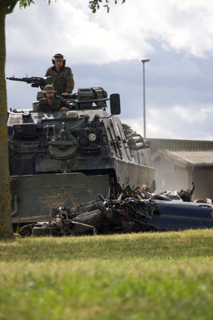 Rund um den großen Platz zwischen Weserufer und Schleppdächern drängen sich die Menschen, wenn die Vorführungen anstehen. Hier zeigen die Pioniere zum Beispiel den Brückenlegepanzer Leguan oder die militärische Version eines Autokrans. Am meisten Aufmerksamkeit aber bekommt der Bergepanzer Büffel, mit dem ein ausgeschlachtetes Auto überrollt und platt an die Seite geschoben wird.